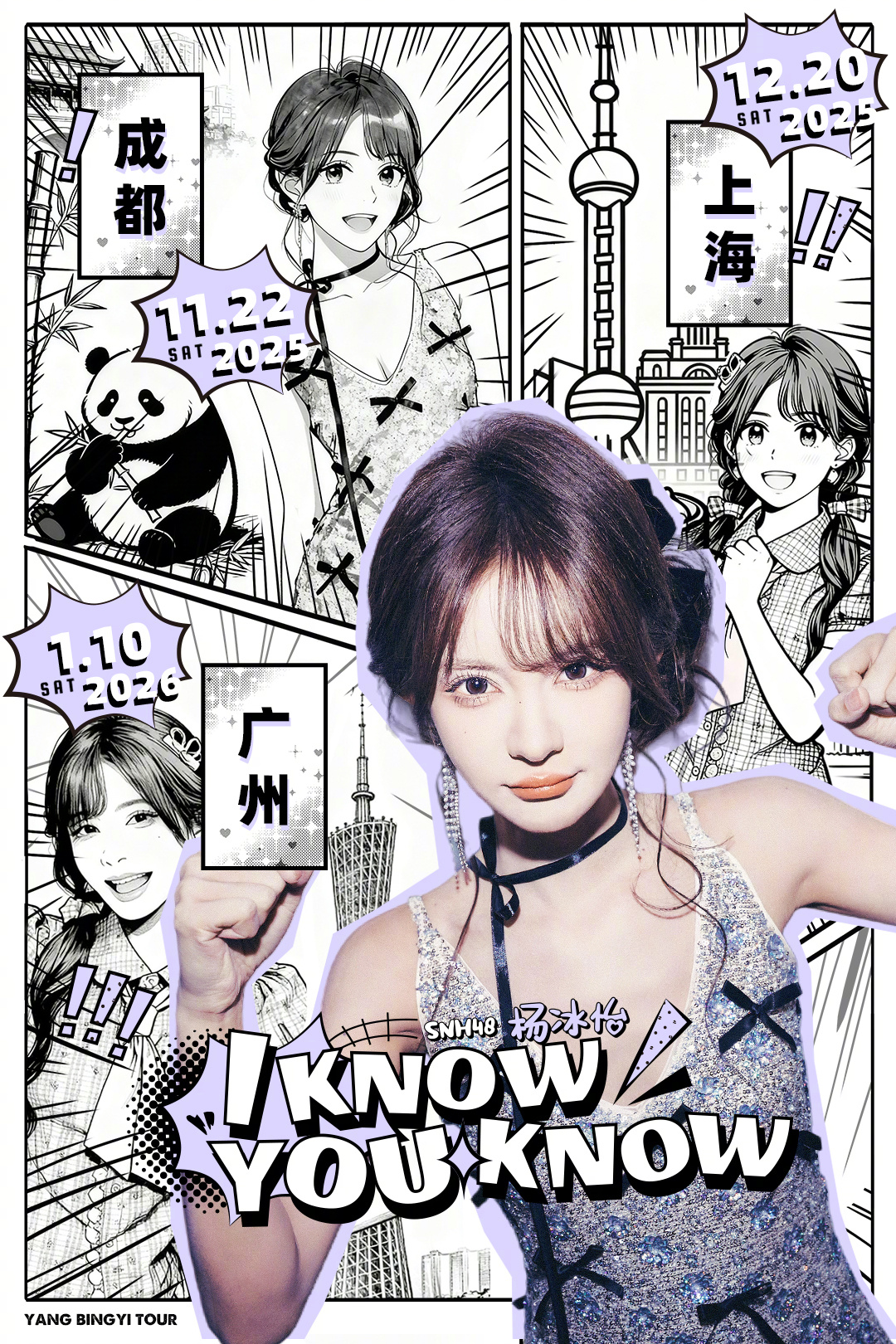 伴随EP发售,杨冰怡个人巡演将正式拉开序幕。首站定于11月22日在成都西村Live举行,随后将于12月20日登陆上海,2026年1月10日抵达广州。巡演主题"I Know You Know"寓意深刻:"I know是我知道,杨冰怡真实的样子及内心想法;You know是你知道,在大家眼中的杨冰怡的形象"。这将是一场展现真实自我、与粉丝进行心灵对话的特别演出。