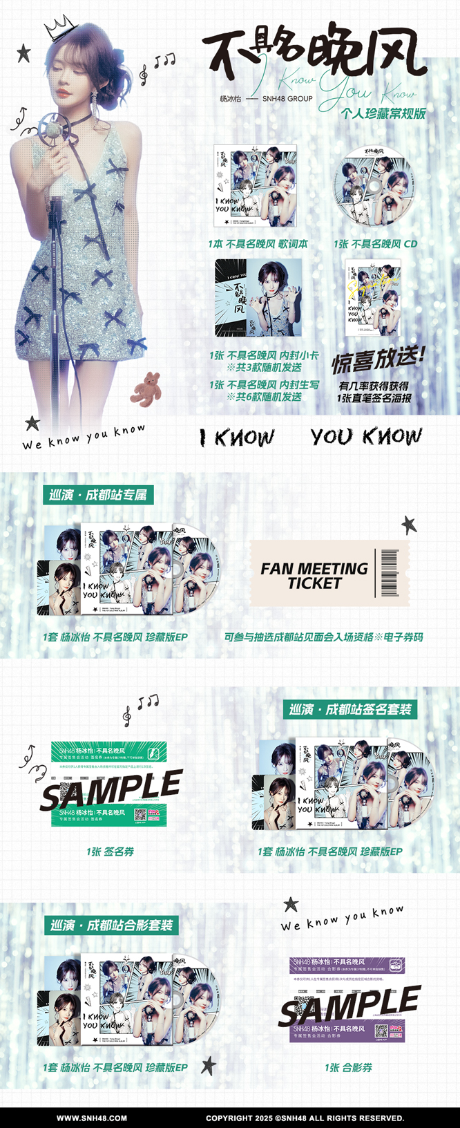 作为2025 SNH48 GROUP年度青春盛典影响力成员金奖及年度巅峰人气QUEEN,杨冰怡的首张个人EP《不具名晚风》共收录了三首精心打造的歌曲:全新原创主打歌《I KNOW YOU KNOW》以及《返校日》《春夏秋冬》两首翻唱曲目。